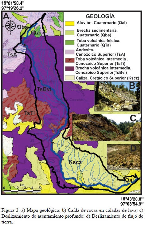 En el área de estudio el relieve es montañoso y escarpado, con elevaciones de 1340 a 5675 m.s.n.m. y pendientes desde los 3° (valles interiores y llanuras) a más de 60° (terreno montañoso). Las pendientes de las laderas son controladas por la litología, por ejemplo, las lutitas débilmente consolidadas y calizas presentan pendientes de hasta 32°. Laderas con pendiente fuerte (32° ‒ 45°) se encuentran en capas de conglomerados cementados, aglomerados y lahares. Los flujos de lava constituyen laderas con pendientes mayores a 45°. La precipitación media anual es de 1000 ‒ 1100 mm/año por arriba de los 4000 m.s.n.m. y de 927 mm/año por debajo de 1500 m.s.n.m. (Palacios et al., 1999). La mayoría de la precipitación se produce entre mayo y noviembre. El cauce del río Chiquito-Barranca del Muerto erosiona un basamento cretácico de caliza y lutita fuertemente intemperizado, disectado y plegado (cubre el 29.7 % del área), que ha sido cubierto por lavas, flujos piroclásticos y depósitos de caída del Neógeno (60.3 %) y del Plioceno-Cuaternario (2.4 %), así como por aluvión (7.6 %) (Figura 2).