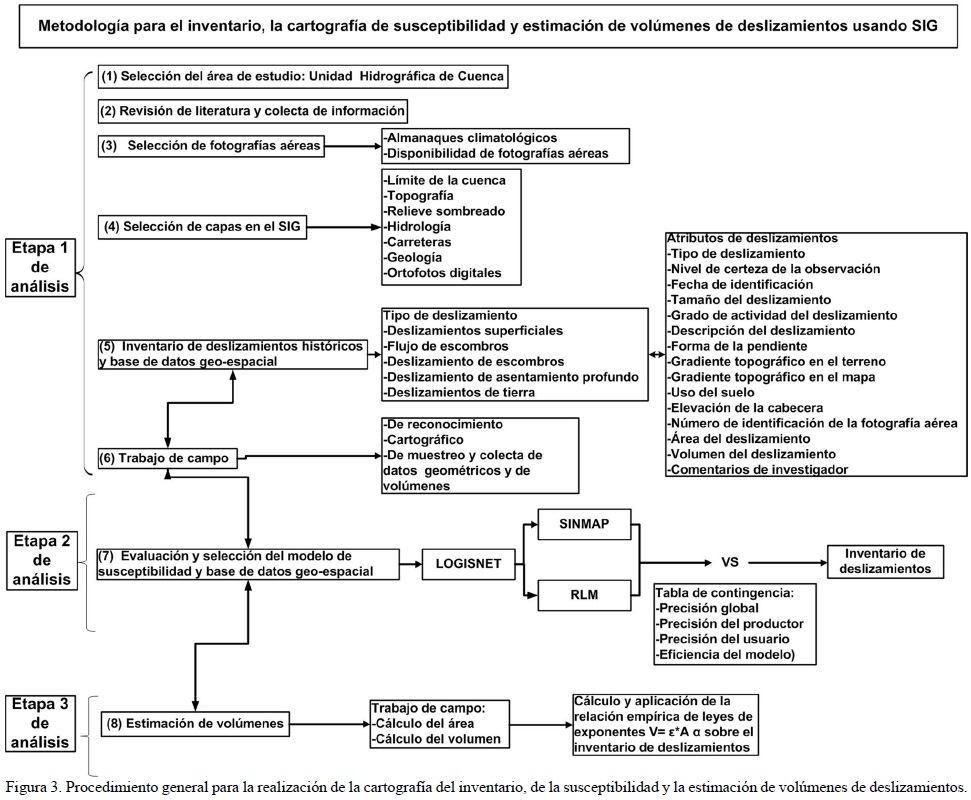 La metodología comprende tres etapas principales. Etapa 1: Elaboración de un inventario de deslizamientos históricos o multitemporal (pasos 1 a 6 en la Figura 3); Etapa 2: Análisis de la susceptibilidad para la cuenca y evaluación de modelos (paso 7, Figura 3), y la Etapa 3: Cálculo del volumen aportado por los deslizamientos al cauce principal (paso 8, Figura 3).