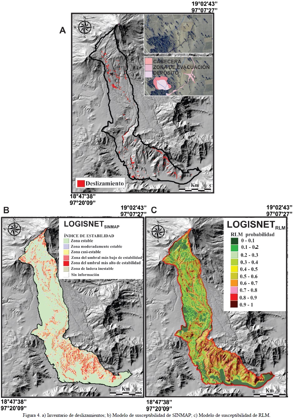 Los inventarios de deslizamientos históricos o multitemporales constituyen la base para los análisis de la susceptibilidad, del peligro y del riesgo por deslizamientos, así como de la estimación de volúmenes de materiales aportados por dichos procesos. Su representación cartográfica y el análisis se llevaron a cabo e incorporaron en los SIG (Peark et al., 2005; Washington State Department of Natural Resources, 2006; Kalderon-Asael et al., 2008; Hervás y Bobrowsky, 2009; Guzzetti et al., 2009; Blahut et al., 2010; Wenkey et al., 2011). Por su parte, la evaluación de la susceptibilidad a deslizamientos y su zonificación se ha abordado de manera heurística, estadística o determinística (Dai et al., 2002; Clerici et al., 2002; Zhou et al., 2003; Metternicht et al., 2005; Demoulin y Chung, 2007; Castellanos-Abella y Van Westen, 2008). Asimismo se han hecho esfuerzos para probar y validar los modelos de susceptibilidad de deslizamientos de tierras (Montgomery y Dietrich, 1994; Pack et al., 1997, 1998, 2001; Morrissey et al., 2001; Dietrich et al., 2001; Borga et al., 2002a, 2002b; Zaitchik et al., 2003; Wawer y Nowocień, 2003; Chinnayakanahalli et al., 2003; Lan et al., 2004; Winsemius et al., 2005; Legorreta-Paulín y Bursik, 2008). A nivel mundial, dos enfoques han sido usados para predecir deslizamientos potenciales en zonas con escasa información espacial: el Índice de Mapeo de Estabilidad (Stability Index MAPping (SINMAP)) y la Regresión Logística Múltiple (RLM). El primero de ellos, fue implementado con un enfoque cartográfico/hidrológico para expresar la estabilidad de la pendiente del terreno en términos de un índice de estabilidad (Pack et al., 1998). Este índice expresa la estabilidad del terreno en una clasificación de seis categorías. El índice es calculado mediante la combinación del factor de seguridad del modelo de estabilidad con pendiente infinita (Hammond et al., 1992) y la teoría de un modelo hidrológico (Beven y Kirkby, 1979; O'Loughlin, 1986). El segundo modelo, la RLM, estima la probabilidad de deslizamientos entre 0 y 1 usando una función logística que considera la contribución de una serie de variables. Esta función tiene una forma sigmoidal que puede ser interpretada como de susceptibilidad mínima de un área a sufrir deslizamientos cuando la función tiene valores bajos y ésta se mantiene como de baja susceptibilidad hasta que cierto umbral es alcanzado, entonces la probabilidad de deslizamientos aumenta rápidamente conforme los valores de la función se incrementan (Kleinbaum y Klein, 2002). Ambos modelos definen bien las zonas que intuitivamente parecen ser susceptibles a deslizamientos (Morrissey et al., 2001; Ohlmacher y Davis, 2003; Yesilnacar y Topal, 2005; Can et al., 2005; Ayalew y Yamagishi, 2005; Meisina y Scarabelli, 2007; Deb y El-Kadi, 2009; Bai et al., 2010; Van Den Eeckhaunt et al., 2005). Estos dos modelos fueron adaptados en el sistema, LOGISNET, mediante el uso de Arc Macro Language (AML) en el SIG ArcInfo. El sistema se ha utilizado para organizar, adaptar, comparar y visualizar los resultados de RLM y SINMAP (Legorreta-Paulín y Bursik, 2009). Sin embargo, la evaluación de los modelos ha sido difícil de realizar debido a la complejidad de problemas concomitantes naturales y técnicos (Zaitchik et al., 2003; Legorreta-Paulín et al., 2010). La evaluación es especialmente difícil en los modelos diseñados para la detección o predicción de deslizamientos superficiales o someros. Esto es debido a que las dimensiones de los deslizamientos superficiales son pequeñas en comparación con otros tipos de deslizamientos (Can et al., 2005). En cuanto a la estimación de volúmenes de material aportado a los ríos por parte de los deslizamientos, éstos han sido llevados a cabo mediante el uso de funciones que usan la ley de potencias, a fin de enlazar las medidas de área de las zonas afectadas por los deslizamientos y el volumen desplazado (Peark et al., 2005; Kalderon-Asael et al., 2008; Guzzetti et al., 2009; Wenkey et al., 2011).