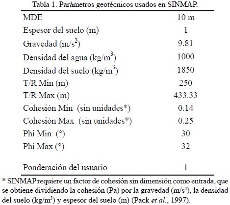 Para la segunda etapa, la susceptibilidad a deslizamientos en las laderas fue analizada usando RLM y SINMAP. SINMAP expresa la estabilidad del terreno utilizando seis clases subjetivas: de 0 > SI (SI es el índice de estabilidad) ("inestable"), 0.5 > SI > 0.0 ("del umbral más alto de estabilidad"), 1.0 > SI > 0.5 ("del umbral más bajo de estabilidad"), 1.25 > SI > 1.0 ("casi estable"), 1.5 > SI > 1.25 ("moderadamente estable"), y SI > 1.5 ("estable") (Figura4b) (Pack et al., 1997, 1998). Las propiedades geotécnicas requeridas para correr el modelo se establecieron con base en valores obtenidos en campo y valores publicados (Tabla 1) para suelos volcánicos, con condiciones que asemejan a las del área de estudio (Selby, 1993; Legorreta-Paulín, 1999; Simon et al., 2000; Wawer y Nowocień, 2003; Simon y Collison, 2002).