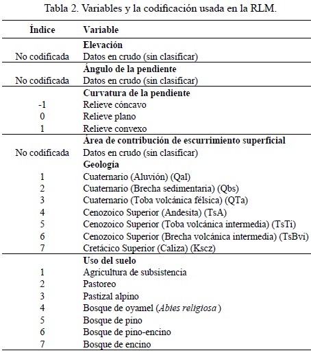 Para el análisis de RLM, se utilizaron seis variables independientes en el análisis (altimetría, pendientes, curvatura del terreno, área de contribución de escurrimiento superficial, geología y uso del suelo). Estas variables fueron examinadas a través del Factor de Inflación de la Varianza (VIF) para diagnosticar su posible multicolinealidad (Pallant, 2005) y codificadas para ser usadas en el análisis (Tabla 2).