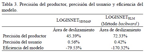 Los resultados obtenidos por ambos modelos de análisis de la susceptibilidad, muestran, desde un punto de vista cualitativo, una alta inestabilidad a lo largo de las zonas montañosas volcánicas y sedimentarias y a lo largo de las paredes del valle de pendientes fuertes. La sobreposición y grado de similitud entre el inventario de deslizamientos y la predicción de los modelos no es perfecta, y existe claramente una sobreestimación de las áreas afectadas por deslizamientos en ambos modelos (Figura 4). Sin embargo, la sobrepredicción se da en áreas que tienen las condiciones necesarias para deslizarse en el futuro, como se pudo observar durante el trabajo de campo. Cuantitativamente, la eficiencia de SINMAP y RLM, se evaluó en términos de precisión del productor, la precisión del usuario y la eficiencia del modelo (Tabla 3). La precisión del productor muestra que la predicción de la RLM tiene mejor coincidencia (72.33 %) con el mapa del inventario de deslizamientos en comparación con SINMAP (45.39 %). Ambos modelos tienen un bajo porcentaje de precisión de usuario y valores negativos en la prueba de eficiencia del modelo debido a su sobrepredicción. Ésta conduce a que más zonas sin deslizamientos sean clasificadas incorrectamente como zonas de deslizamiento en el modelo.