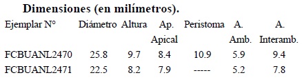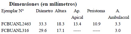 Para la descripción de los especímenes colectados, se hace indispensable el incluir las medidas de los ejemplares que han de ser ilustrados. En la descripción de los equinoideos tradicionalmente se han utilizado diferentes parámetros de medición, los cuales para este trabajo son: diámetro de la concha, altura, ancho, anchura de los ambulacros e interambulacros, así como los tipos de ornamentación que presenta el esqueleto para los equinoideos (Moore, 1966). El material descrito en este trabajo se encuentra depositado en la colección del Laboratorio de Paleobiología de la Facultad de Ciencias Biológicas en la Universidad Autónoma de Nuevo León: FCBUANL2463, FCBUANL2464, FCBUANL2465, FCBUANL2466, FCBUANL2467, FCBUANL2472, FCBUANL2473, FCBUANL2496, FCBUANL2497, FCBUANL2462, FCBUANL2470, FCBUANL2471, FCBUANL2449, FCBUANL2454, FCBUANL2458, FCBUANL2477, FCBUANL2475, FCBUANL2443, FCBUANL2479, FCBUANL2591 FCBUANL2529, FCBUANL2246, FCBUANL316.