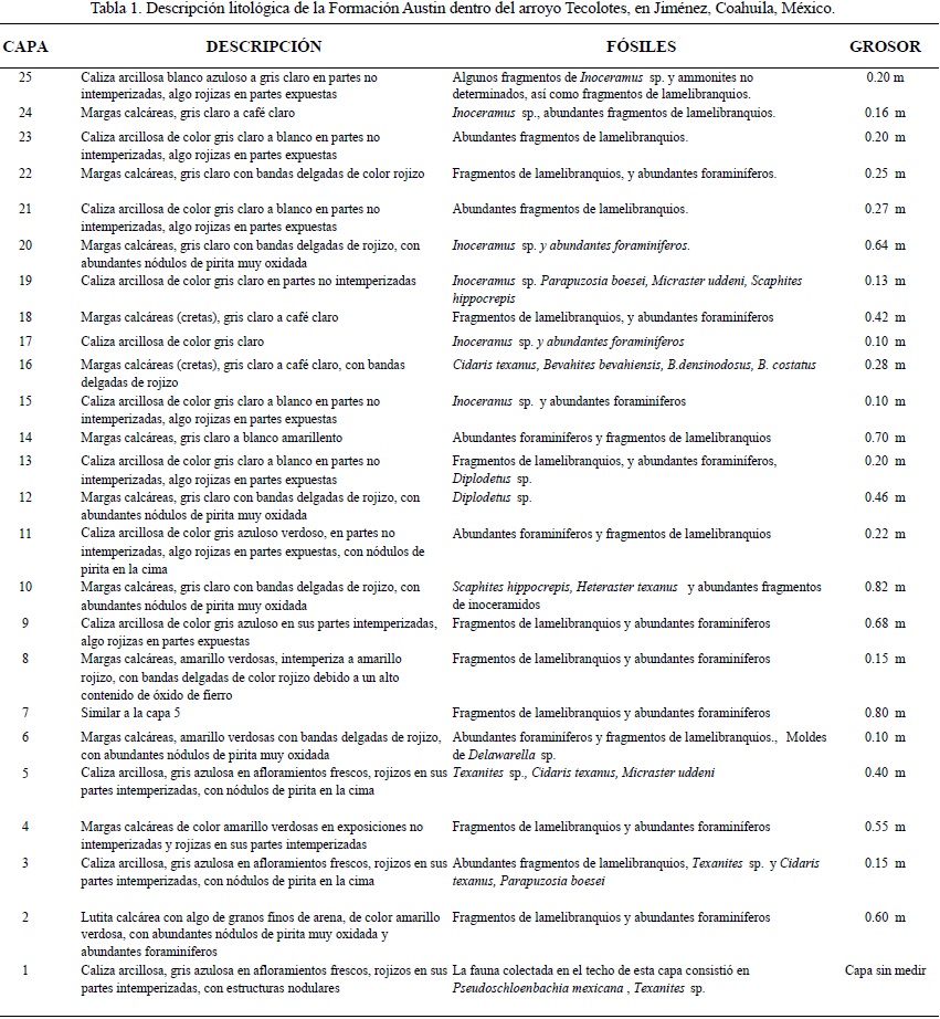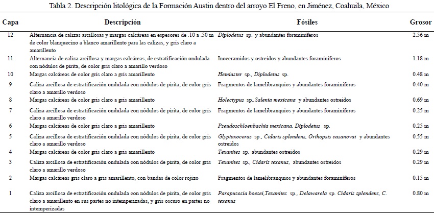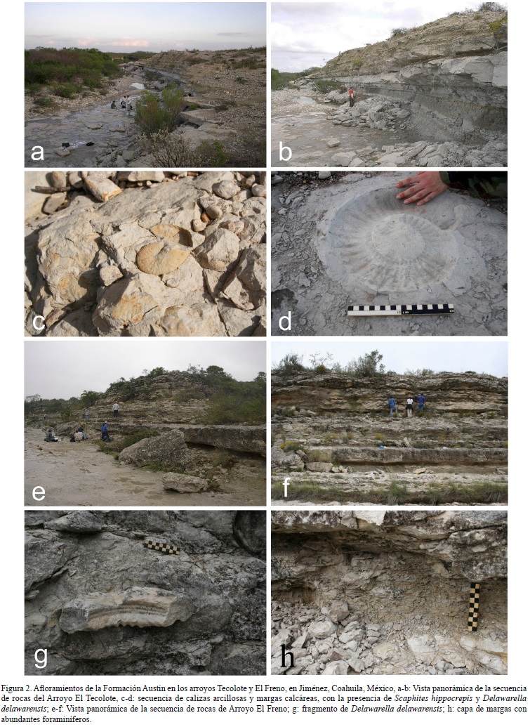 En las localidades de los arroyos El Tecolote y El Freno, Jiménez, Coahuila, se observa una predominancia calcárea desde la base de la sección hasta los primeros 3 m de la misma, siendo las margas más frecuentes hacia el techo del corte. De acuerdo a Carrasco (1969) estas características pueden asignarse a la Formación Austin, del Cretácico Superior. En diversos niveles de la sección (Figuras 3 y 4) se observa la presencia de los ammonites Scaphites hippocrepis y Delawarella delawarensis, que de acuerdo a Young, 1963 y Adkins, 1929, permiten asignar a la Formación Austin en el área de estudio al Campaniano Inferior.