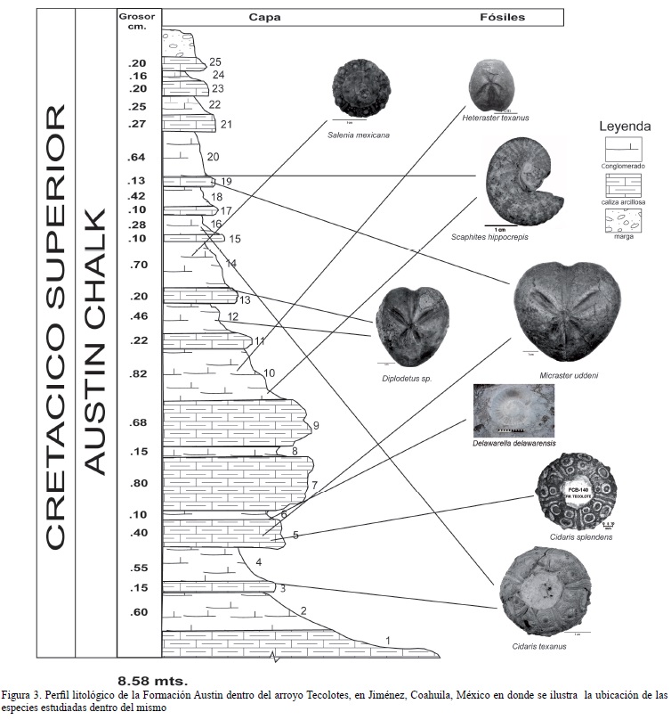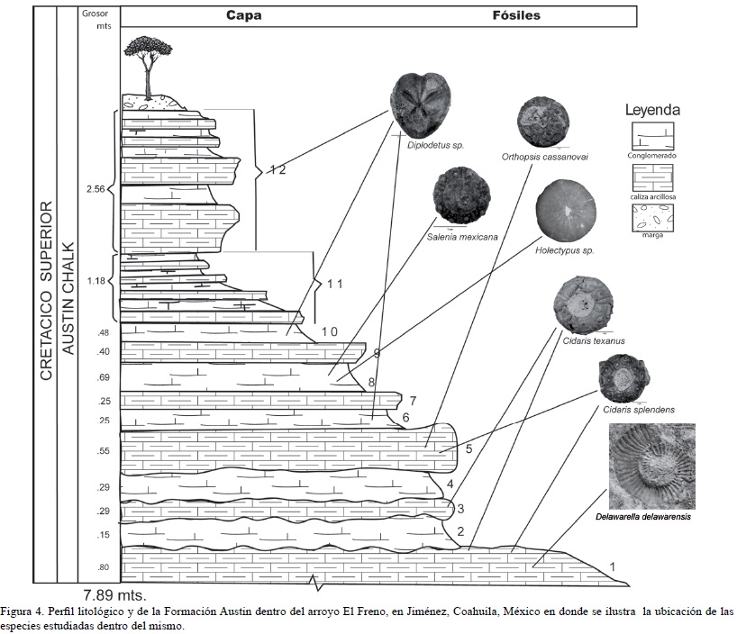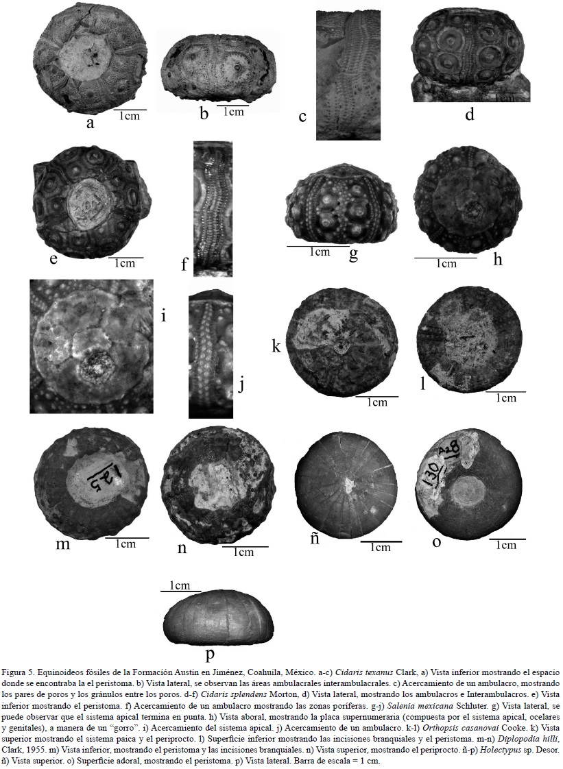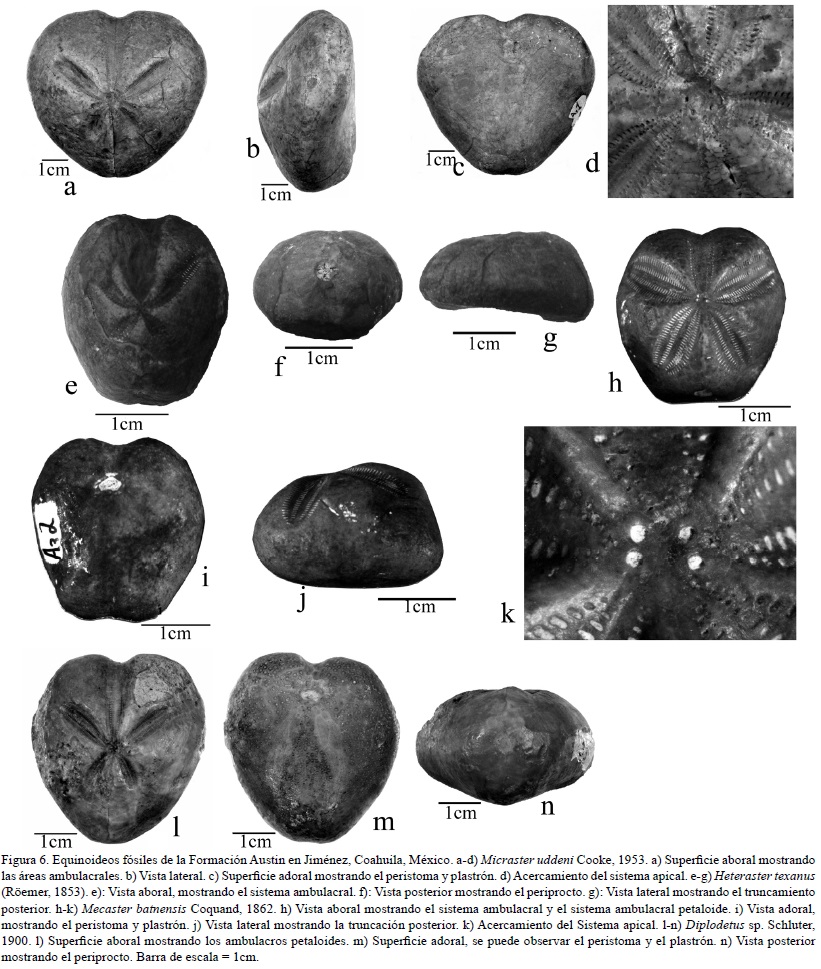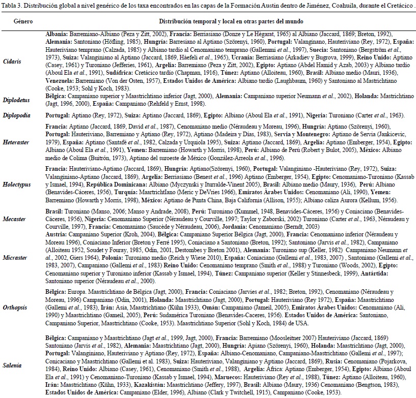 Por otra parte, la presencia de Cidaris texanus, Cidaris splendans, Heteraster texanus y Salenia mexicana en la Formación Austin en Coahuila, es notable, ya que estas especies han sido reportadas únicamente para sedimentos del Cretácico Inferior de México. Por lo tanto, el reporte de estas especies en la Formación Austin extiende su registro para el Campaniano Inferior de México. En particular, la presencia de Heteraster texanusen México es consistente con la presencia de este género en el Campaniano de Texas, reportado por Cooke (1953), lo que su vez sugiere que esta especie junto con las reportadas en Jiménez, Coahuila, pudieron haber habitado la parte sur del Mar Interior del Oeste de los Estados Unidos de Norteamérica durante el Campaniano, debido a su conexión de éste con el Proto océano Atlántico. Con base a lo anterior, se sugiere una revisión más exhaustiva de la distribución geográfica y temporal de los grupos descritos en este trabajo para precisar sus alcances estratigráficos y paleobiogeográficos, así como su aplicación en estudios bioestratigráficos posteriores.