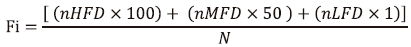 Where n is the corresponding number of specimens assigned to each of the three different fragmentation degrees (HFD, MFD and LFD), and Nis the total number of specimens, studied in the sample.
