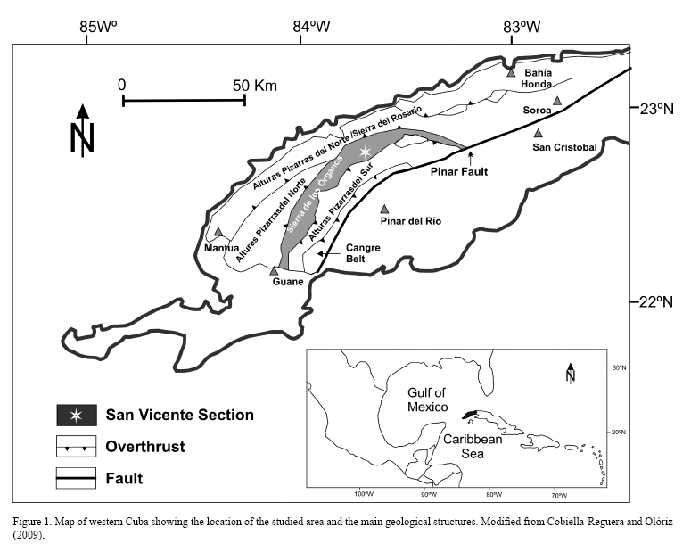Western Cuban Jurassic/Cretaceous rocks are mainly exposed in the Sierra de los Órganos Belt (Figure 1). Those rocks are recorded in the Guasasa Formation (Herrera, 1961), a formal unit subdivided into four members (older to younger): San Vicente, El Americano, Tumbadero, and Tumbitas (Figure 2). The studied section includes rocks of the upper part of the San Vicente, and the whole of the El Americano and Tumbadero members.