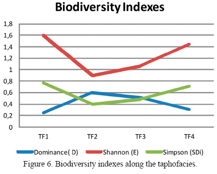 To determine the variations in the paleobiological community various biodiversity indexes were analyzed. The species richness is a simple index obtained by counting the specimens of each species contained in the sample and plotting their relative abundance on circular diagrams for a visual estimation of the composition assemblage (Hammer and Harper, 2006).