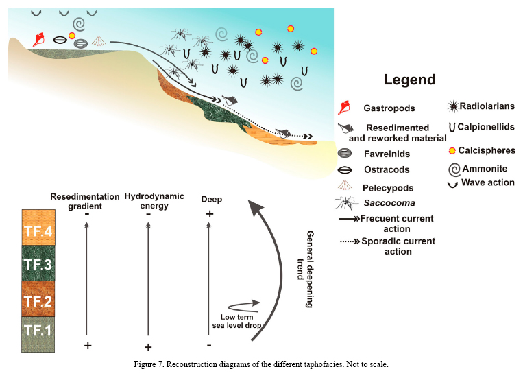The interpreted environment along the section is characterized by variations in a general deepening trend, only interrupted by a short-term sea-level drop. Taphofacies 1 corresponds to a shallow water environment with wave action and a mainly benthic community. A sudden change to pelagic conditions reflected in taphofacies 2 caused a disturbance in the paleoecological and sedimentation conditions, resulting in dominance by Saccocoma. Common resedimented entities manifest the frequent action of currents on this taphofacies. The influence of the resedimentation decreases in taphofacies 3 and 4 and shows only sporadic current action in the offshore environment. A sea level drop is recorded in this interval. The high production of organic matter in TF3 responds apparently to upwelling currents that disappear in TF4.
