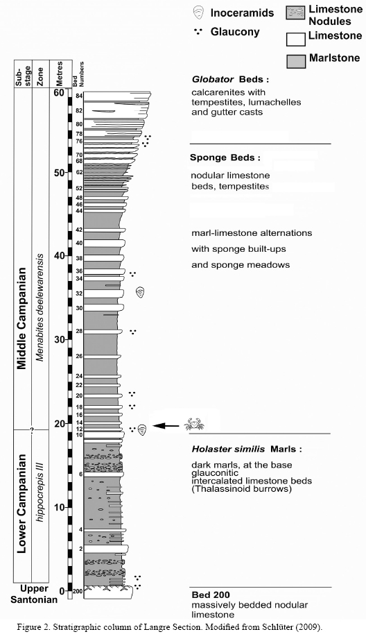 In Langre (3 km east of Loredo), coastal cliff exposures permit a complete study of the section from Santonian to Campanian time. Schlüter (2009) proposed five litho units, ranging from lower to middle Campanian for these exposures: Holaster similis Marls, Sponge Rhythmites, Burrow Infilled Generated Facies, Pycnodonte Layers and Globator Beds (Figure 2). This section is well correlated with the neighbouring Loredo outcrops. The crab described in this study was collected from the basal part of the Sponge Beds, middle Campanian (Menabites delawarensis zone) that overlies the lower Campanian Holaster similis Marls (Rehfeld and Otto, 1995) (Figure 3). The sponge Beds consist of alternating marl-limestone beds deposited on a distal shelf that grade into shallow marine ramp carbonates with tempestites, indicating deposition above storm wave base (Schlüter et al., 2004). The dominant fauna are sponges, Exogira spinosa, and echinoids (Schlüter et al., 2004).Additional information on the geology of the area can be found in Rehfeld and Otto (1995), Wilmsen et al. (1996), and Schlüter et al.(2004).