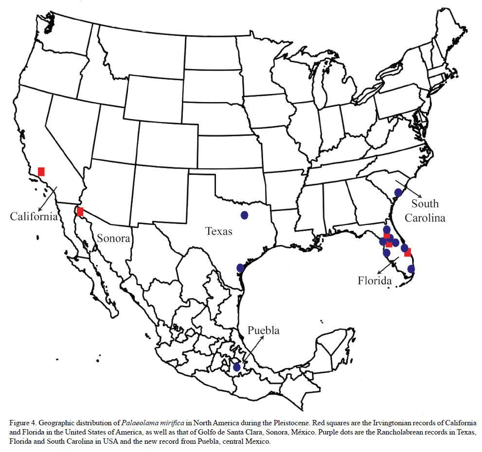The oldest records of Palaeolama mirifica are from the latest Blancan of Florida (Ruez, 2005). There are records in California and Florida (Figure 4), and in the Rancholabrean the records of this llama are from South Carolina, Texas, and Florida (Figure 4); in addition there a record from Costa Rica (Pérez, 2013). Thus, the presence of this llama in Puebla extends its former Pleistocene geographic distribution southwardly, from southern United States to central Mexico, representing the most southern occurrence within North America (Figure 4) and fills the geographic gap with the Costa Rican record.