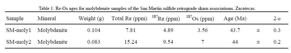 El depósito de Zn-Pb-Cu(-Ag±Au) de San Martín en el noroeste de Zacatecas es uno de los skarns de mayor importancia económica y tamaño en México. Las asociaciones minerales de este depósito pertenecen a la tipología de los skarns de sulfuros (con zonaciones prógradas y retrógradas "clásicas") y contiene en su periferia vetas subepitermales a epitermales. Se obtuvieron edades Re-Os en este depósito para dos muestras de molibdenita de mineralizaciones retrógradas de Cu-Zn-Pb±Mo±Bi±Ag, en 43.7 ± 0.3 y 44.0 ± 0.2 Ma, que corresponden esencialmente a la misma edad. Éstas son de 1 a 3 millones de años más recientes que las edades K-Ar preexistentes del stock granítico responsable de la formación de estos depósitos. Las asociaciones minerales prógradas se interpretan en este trabajo como directamente asociadas a dicho intrusivo. Por lo tanto, puede calcularse una simple tasa de descenso de temperaturas para los fluidos hidrotermales de entre ~100º y > 300 ºC por millón de años, desde las asociaciones prógradas, de skarn, a las retrógradas. Las vetas subepitermales y epitermales, sin embargo, todavía carecen de determinaciones geocronológicas.