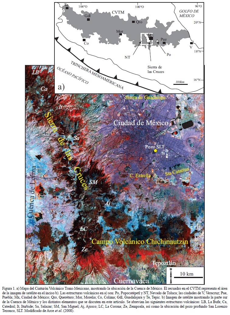 A nivel regional la Cuenca de México se encuentra dentro de la provincia geológica del Cinturón Volcánico Trans-Mexicano (Figura 1A), definido como un arco volcánico producido por la subducción de la Placa de Cocos y Rivera por debajo de la placa Norteamericana (Pardo y Suárez, 1995; Ferrari et al., 1999). A nivel local, esta cuenca está limitada por sierras volcánicas conocidas como Sierra de las Cruces al oeste (e.g.: Mora-Alvarez et al., 1991; Osete et al., 2000; Mejia et al., 2005; Arce et al., 2008), la Sierra Chichinautzin al sur (Bloomfield, 1975; Marquez et al., 1999; Siebe et al., 2004; Meriggi et al., 2008), Sierra Nevada al este (Cadoux et al., 2011; Macías et al., 2012) y Sierra de Pachuca y Campo Volcánico Apan-Tezontepec al norte (López-Hernández, 2009; García-Palomo et al., 2002), constituidas por diversas estructuras volcánicas de distintas edades.