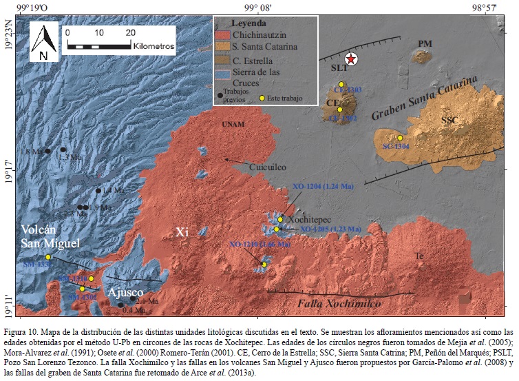 Additionally, we conclude that the rocks belonging to the Xochitepec Formation, outcropping around Xochimilco, in Mexico City, have an age of 1.23 to 1.66 Ma, in contrast with the Oligocene age proposed in previous works for these rocks. These new ages plus the chemical composition data allow us to correlate the Xochitepec rocks with those from Sierra de las Cruces.