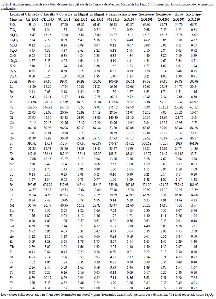 En total se colectaron en el campo 11 muestras, de las cuales se elaboraron láminas delgadas. Estas láminas fueron descritas con ayuda de un microscopio petrográfico, poniendo énfasis en la textura, asociación mineralógica y características de cada fase mineral. Las mismas 11 muestras de roca fueron pulverizadas, con el fin de llevar a cabo análisis químicos de roca total, por el Método de Fluorescencia de Rayos X (FRX), en el Laboratorio Universitario de Geoquímica Isotópica (LUGIS, UNAM) para determinar elementos mayores y pérdida por calcinación (Tabla 1) y por el Método de Inductively Coupled Plasma Mass Spectrometry (ICP-MS) para determinar elementos traza (Tabla 1), el cual se llevó a cabo en el Centro de Geociencias, UNAM, en Juriquilla, Querétaro. Las metodologías detalladas están descritas en Lozano-Santacruz y Bernal (2005) para FRX y Mori et al. (2007) para ICP-MS.