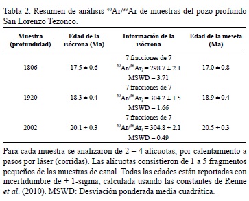 Con el objetivo de extender el registro geocronológico existente (Arce et al., 2013a), se enviaron tres muestras del pozo profundo San Lorenzo Tezonco, al Laboratorio de Geocronología de la Universidad de Alaska, Fairbanks, E.U.A., para llevar a cabo fechamientos radioMétricos con el Método de 40Ar/39Ar (Figura 4 y Tabla 2) y de esta manera complementar el registro geocronológico del pozo profundo. Estos tres nuevos fechamientos corresponden con las muestras más profundas del pozo San Lorenzo Tezonco, ubicadas a 1806, 1920 y 2002 metros de profundidad.