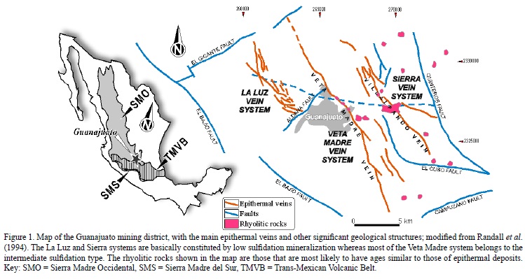 The Guanajuato mining district (homonymous state, central Mexico) has been historically one of the largest silver producers in Mexico. Such endowment comes from polymetallic or Au-Ag epithermal deposits that have been extensively mined since the 16th century. The mineral wealth from these deposits was estimated in 40 Mt at 850 g/t Ag and 4 g/t Au, plus significant concentrations in Pb and Zn (Albinson et al., 2001). These deposits are basically intermediate to low sulfidation epithermal veins and stockworks, in which intermediate sulfidation mineral assemblages, when present, occupy the deepest portions of mineralized structures (or "type B", according to Camprubí and Albinson, 2006, 2007). In fact, the different groups of mineralized structures cluster into dominantly intermediate or low sulfidation veins. Such clusters are named, west to east, as the La Luz system, the Veta Madre (which can be translated as "Mother Lode"), and the Sierra system (Figure 1), also known as El Cubo system. The large Veta Madre vein is dominantly an intermediate sulfidation vein (Camprubí and Albinson, 2006, 2007), whereas the La Luz and Sierra systems are, at their presently known exposures, low sulfidation sets of veins (Abeyta, 2003; Devlin and Hansen, 2009).