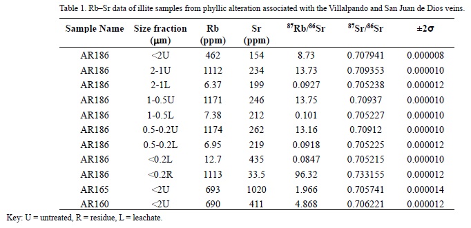 For this study, we selected samples of pervasively altered rhyolitic rocks (Figure 2): two of them came from fresh outcrops adjacent to the Villalpando vein, and one sample came from underground exposures of the San Juan de Dios vein. In both cases, they were obtained from phyllic alteration assemblages. The samples of the Villalpando vein consist of illite and smectite (not mixed-layered illite-smectite), whereas the sample from the San Juan de Dios vein consists of pure illite. The samples thus used for RbSr geochronology yielded an isochron age at 28.47 ± 0.55 Ma. These results are presented in Table 1 and Figure 3.