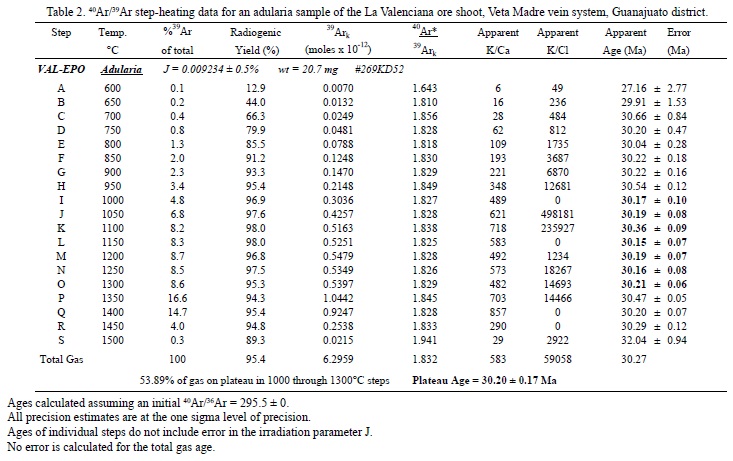 The adularia sample was analyzed at the U.S. Geological Survey Thermochronology lab in Denver (Colorado, USA), using the 40Ar/39Ar step-heating method (from 600° to 1500 °C; Table 2) and a VG Isotopes 1200B mass spectrometer fitted with an electron multiplier. For additional information on the analytical procedure see Kunk et al. (2001). The analyzed sample corresponds to a "classical" collector's specimen of large and saddle-shaped drusy adularia crystals or "valencianite" that are characteristic of this specific location. This sample yielded a 40Ar/39Ar plateau age at 30.20 ± 0.17 Ma.
