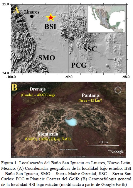 El BSI se ubica dentro de un área cuya superficie es de ~ 5 km2 aproximadamente (Figura 1 B) y pertenece a un tipo de manantial denominado manantial de montículo, definido como un cuerpo central de agua, con un margen externo de canales y vegetación, un canal de flujo y capas sucesivas de carbonatos (Blinn et al., 1994; Mudd, 2000). En este caso, el agua subterránea alcanza la superficie elevándose a través de una fractura natural, en lugar de hacerlo a través de un agujero producido artificialmente. Este tipo de manantiales se forma por evaporación de aguas mineralizadas de manantiales artesianos, en los que ocasionalmente pueden ocurrir adiciones de material transportado por el viento en regiones áridas y semiáridas (Mudd, 2000). El montículo de manantial del BSI se localiza dentro de lo que constituye la Planicie Costera del Golfo de México (GMCP), que se extiende aproximadamente unos 1450 km a lo largo del Golfo de México, desde el estado de Tamaulipas (sobre la frontera de Texas) hasta los estados de Veracruz y Tabasco hasta la Península de Yucatán (De Cserna, 1989); dicha planicie está flanqueada en su sector occidental por la Sierra Madre Oriental (SMO), un cinturón de falla y cabalgadura de cinturón sedimentario (Goldhammer, 1999; Chávez-Cabello et al., 2004), y hacia el sector este por la Sierra de San Carlos relacionada al magmatismo (Treviño-Cázares et al., 2005). El manantial hidrotermal BSI tiene forma de una laguna semicircular (Anderson, 1984) y ocupa una superficie de aproximadamente 2500 m2, exhibiendo una profundidad máxima de 7.5 m en forma de cono invertido y truncado, conformado por limos y carbonatos en suspensión (condición de fluidez) por la presión del agua saliente de los poros. Las unidades sedimentarias de basamento expuestas en la superficie del área estudiada pertenecen a sedimentos de las formaciones San Felipe y Méndez y corresponden al Cretácico Superior de la Sierra Madre Oriental. La Formación San Felipe (Turoniano-Coniciano) consiste de 110 a 150 m de estratificación delgada laminar con calizas de color gris pálido, interestratificadas con lutitas, porcelanitas (carbonatos silicificados), y con capas de ceniza volcánica alterada (Seibertz, 1998; Sohl et al., 1991; Garza-Castillo, 2006). La Formación Méndez (Campaniano-Maastrichtiano), constituida por lutitas frágiles oscuras, con coloraciones verdosas a negras e intercalaciones menores, descansa concordantemente a la Formación San Felipe y está bien expuesta en el área bajo estudio. Aunque López-Ramos (1982) reporta un diámetro máximo de ~ 1500 m para esta unidad, en el área del BSI aparece como un estrato plegado de estratificación delgada. Adicionalmente la localidad BSI está rodeada por sedimentos recientes de aluvión y travertino que derivan de la formación San Felipe.