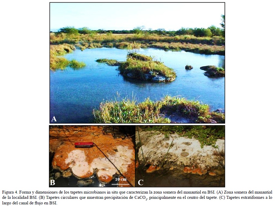El BSI representa un manantial sulfuroso con fluctuaciones de pH entre 7 y 7.6, y con temperaturas alrededor de LOS 36.4 °C en verano y alrededor de 31 °C en invierno. Aunque la temperatura es aproximadamente constante a lo largo del canal principal, existe un gradiente muy tenue desde la fuente del manantial, con temperaturas alrededor de los 37.5 °C hasta los 35 °C en las facies distales (Figura 2 A). Los resultados obtenidos a lo largo de este estudio muestran que el desarrollo de tapetes microbianos en los márgenes del manantial de BSI es constante a lo largo de los diferentes periodos estacionales, mientras que las terrazas que bordean el canal están formadas mayoritariamente por travertino asociado (Figuras 2 B y C). Los travertinos exhiben diferentes grados de calcificación superficial, y en algunos casos, ésta es correlacionable con el desarrollo de tapetes microbianos, los cuales pueden encontrarse como tapetes estratiformes o como tapetes flotantes. La persistencia de tapetes microbianos se ha monitoreado por varios años y en las diferentes estaciones del año, por lo que podría decirse que son perennes o se forman continuamente en cada punto del transecto.