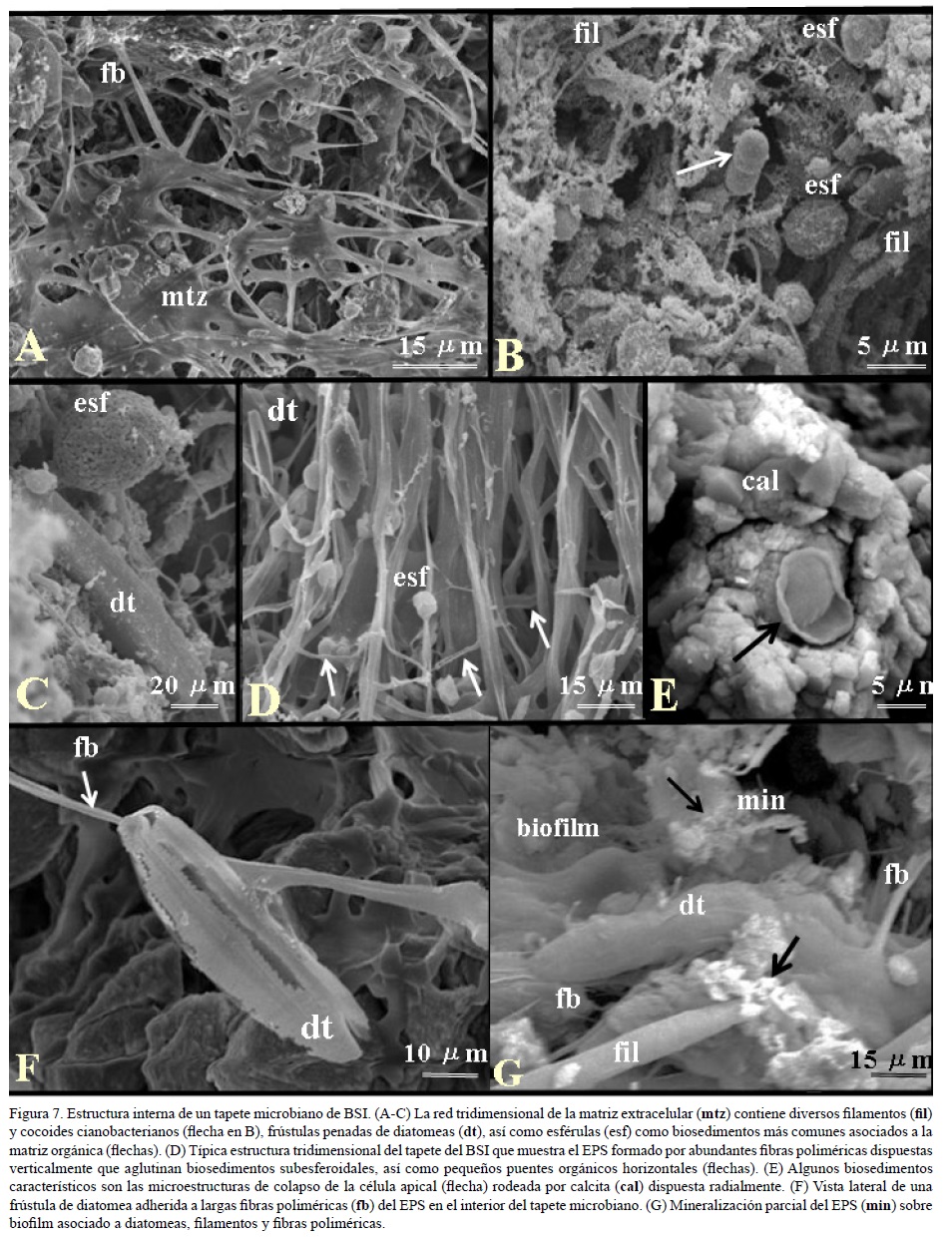 El tapete microbiano está estructurado por una malla orgánica irregular a la que se adhieren partículas sedimentarias y material polimérico, por lo que se presume la naturaleza cohesiva de la matriz extracelular (Figura 7A). Además de la alta porosidad en el interior de los tapetes del BSI, en otras regiones de la infraestructura orgánica se observa una textura microgranular heterogénea asociada a cianobacterias filamentosas y cocoides, así como a agregados subesféricos (Figura 7B). El área más estructurada del tapete corresponde a las zonas finamente laminadas, cuyas micrografías SEM exhiben una alineación paralela de fibras orgánicas a las que se adhieren precipitados de calcita y material orgánico más fino (Figura 7C). Los agregados subesferoidales (Figuras 7 B y D), las delicadas estructuras orgánicas rodeadas por calcita euhedral (Figura 7E) y la presencia de largas fibras poliméricas que unen diferentes tipos de precipitados (Figura 7F) se encuentran entre los biosedimentos más característicos de los tapetes microbianos del BSI. Existen fibras orgánicas extensas que muestran una asociación estrecha con diatomeas en áreas con gran cantidad de biofilm (Figura 7G), y donde es posible observar fibras que se proyectan a partir de la parte apical de una diatomea y están asociadas a material polimérico extracelular (EPS) y precipitados amorfos.