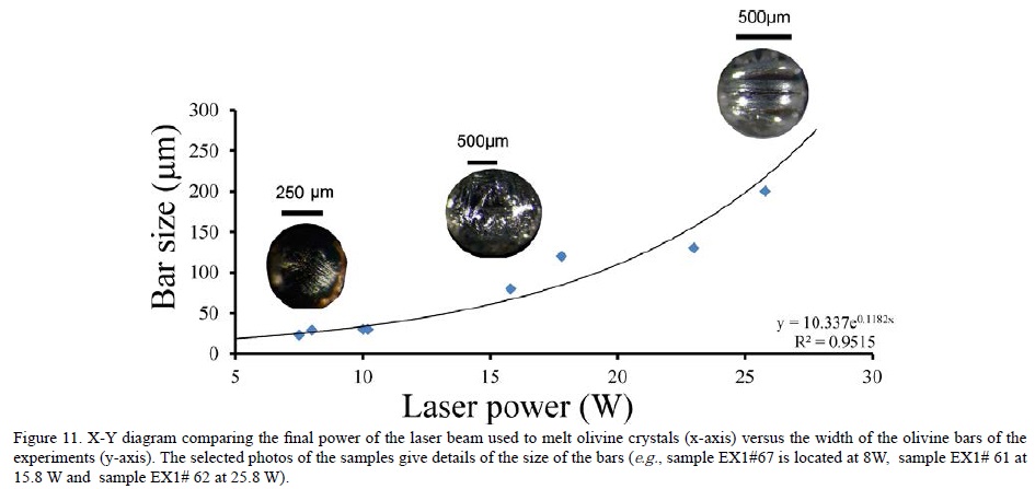 There is a clear relationship between the morphology of the samples and the beam power applied. The samples melted with a beam power greater than 15 W, and developed pronounced variable (from 20 to 200 µm) empty spaces between olivine bars. There is a negative correlation between the amount of olivine bars and the decreasing power of the beam. Furthermore, there is a positive correlation between the width of the bars and the increasing laser power (see Figures 2, 3, 4, 5, 6, 7 and 11). The samples showing narrow gaps between bars correspond to beam powers lower than 11 W. We found that the bar size is a function of the applied power of the laser beam (y = 10.337 e0.1182x, Figure 11). This corresponds to the number of crystallization nuclei that survives due to the high energy applied. Other experiments, using laser, confirmed that the cooling rates are related to the size of the crystals (Nelson et al., 1972; Blander et al., 1976), however, these results cannot be directly compared with ours because their system contains enstatite.