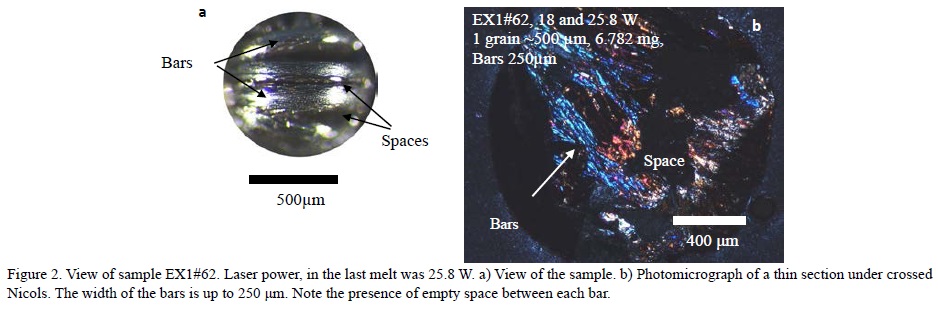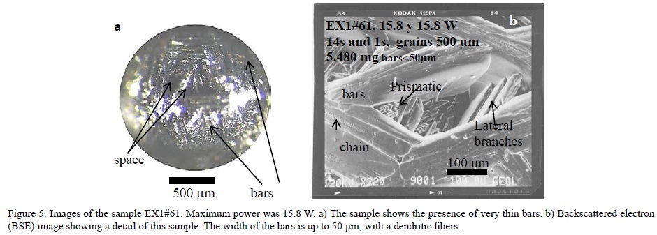 The bars of samples EX1#67, EX1#60, and EX1#8 did not have empty spaces in between (Figure 6 and 7). These bars showed different orientations. A study by SEM revealed that chain olivine morphology is common (Figure 6). The experiment EX1#8 presents thin chains of olivine. Cross sections of these samples showed dove-shape crystals and the rim of the sphere clearly differentiated from the interior of the melt (Figure 7). The final power of the beam used to irradiate samples was between 10 and 7.5 W (see Table 3).