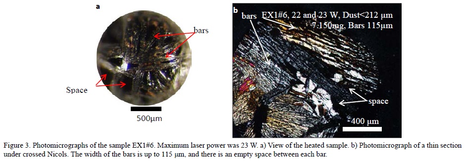 • The width and amount of olivine bars are related to the energy of irradiation, i.e., the more energy used (higher temperature), the bars of olivine are fewer and wider in the sample. However, these bars are also larger and thicker. This is due to the fact that there are fewer crystallization nuclei that compete for the available matter.