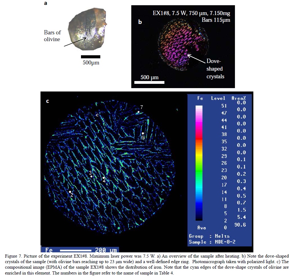 We observed prismatic crystallites of olivine with well-developed faces at their endings between the bars of samples EX1#65 and EX1#61. Those bars are connected by lateral branches and chain olivine according to the dendrite morphology used by Faure et al.(2003a, b) (Figure 4 and 5, respectively). The final power of the beam supplied to melt these samples ranged between 25.8 and 15.8 W (see Table 3).