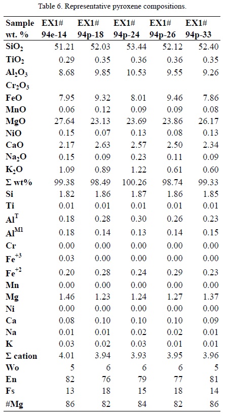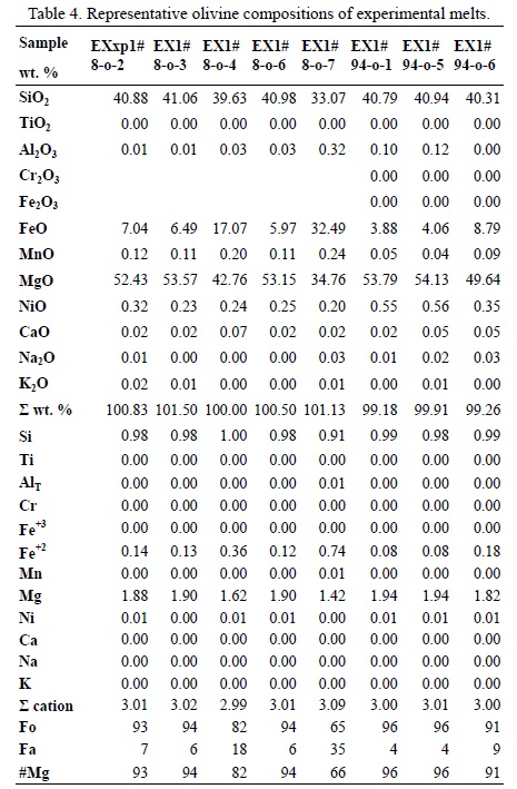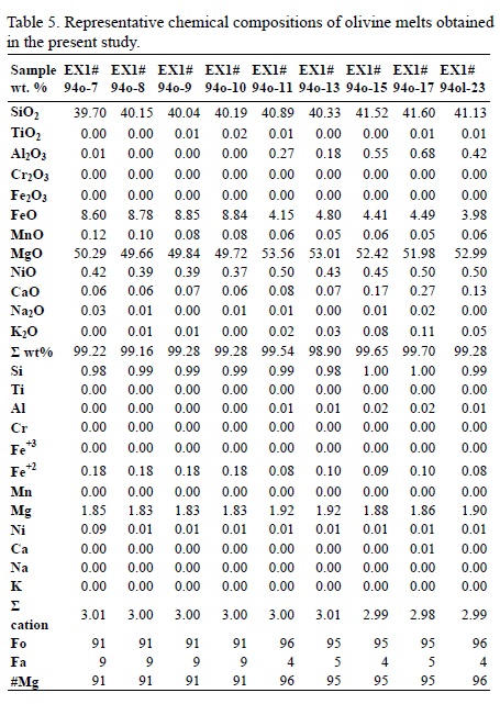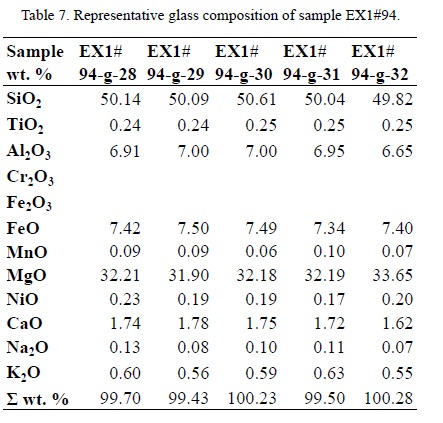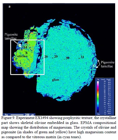 The melt EX1#94 is representative of the porphyritic textures. Olivine and pigeonite phenocrysts were found near the surface of the sample (Figure 8a and b). Figure 9 showed phenocrysts of olivine embedded in glass for sample EX1#94. Olivine presents homogeneous composition (Fo 91 mol %) (Table 5; Figure 10). Crystals of olivine had straight edges with respect to the glass of the sample. Near the surface, olivine phenocrysts exhibited reaction bays and elongated crystals of olivine (Fo 96 mol %) interspersed with internal lamellae of pigeonite (~ En 79 mol %, Wo 6 mol %, see Table 6; Figure 10). Figure 10 shows that the edges of the crystals of olivine react with the glass. This reaction results in pigeonite lamellae and MgO %-enriched olivine. The composition of the glass is homogeneous and is enriched in iron and magnesium oxides (~ 7 and ~ 30 wt %, respectively, Table 7). The compositional image taken by EPMA shows the distribution of magnesium, with the olivine core enriched in this element (Figure 9).