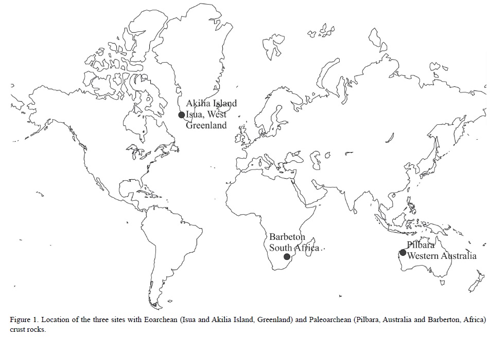 The identification of the earliest life signatures is made difficult by the fact that the oldest crustal rocks from the Paleoarchean Era have been destroyed. In addition, only a few localities with rocks of such antiquity are known. Paleoarchean rocks are located in the Pilbara greenstone belts in northwestern Australia and the Barberton greenstone belts in eastern South Africa (Westall, 2005; Schopf, 2006) (Figure 1).