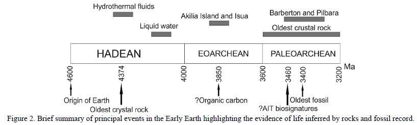 A brief summary of the principal events related to the first evidence of life in the Hadean and the Lower Archean is shown in Figure 2.