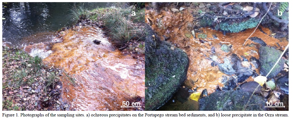 Iron oxide precipitates were collected in areas close to the abandoned Touro copper mine (NW Spain, 42° 52' 34" N 8° 20' 40" W) and the abandoned Fontao tungsten and tin mine (NW Spain, 42° 45' 16" N 8° 13' 55" W) between September and October 2013. In the area encompassing the Touro mine, which was exploited between 1974 and 1988, the geological substrate predominantly consists of amphibolite, with large quantities of metal sulphides such as pyrite and chalcopyrite. Weathering and oxidative dissolution of these minerals has led to the release of AMD to the neighbouring streams, producing frequent episodes of extreme acidity and mobilization of toxic elements in the surface waters (Álvarez et al., 1993). During the last 15 years, remediation processes and environmental monitoring have been conducted at the most critical sites (Álvarez et al., 2011). The area encompassing the abandoned Fontao mine, which was exploited between 1934 and 1973, includes numerous Sn-W quartz veins, with cassiterite and wolframite as the main ore minerals and with a significant presence of sulphide minerals such as pyrite, chalcopyrite and arsenopyrite.