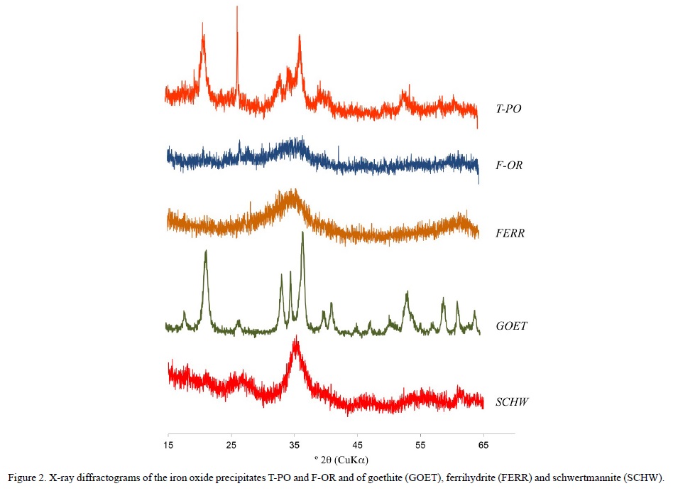 The iron oxides present in sampling sites T-PO and F-OR were characterized by XRD and the diffractograms were compared with those obtained for the synthetic analogues. The X-ray diffractograms revealed significant differences in the mineralogy of the iron oxides collected at both sampling sites (Figure 2). The dominant mineral phase in sample F-OR is an amorphous iron oxide that resembles ferrihydrite. The diffractogram shows a broad band at ~ 35° and a low intensity band at higher 2θ, ~ 60 65°. No additional peaks indicating the presence of goethite or schwertmannite were found for this sampling site. The absence of schwertmannite phases confirms that sampling site F-OR was not greatly affected by AMD discharges from the nearby abandoned tungsten-tin mine. Sample T-PO presents several peaks that can be assigned to the presence of goethite. According to Asta et al. (2010), the weak XRD peaks of schwertmannite can be masked by the peaks of more crystalline phases, which are usually of higher intensity. The XRD data do not clarify whether goethite is the only iron oxide phase formed or schwertmannite is also present. The metastable character of schwertmannite particles favours phase transformation to goethite or other iron crystalline phase within weeks or months, depending on the physico-chemical conditions and water chemistry of the AMD system. Studies by Kumpulainen et al. (2007) and Peretyazko et al.(2009) on the mineralogy of AMD precipitates showed seasonal variations in the occurrence of both mineral phases. Schwertmannite was the dominant mineral present during spring, but it was then partially transformed to goethite during the warmer summer months because of changes in the water chemistry.