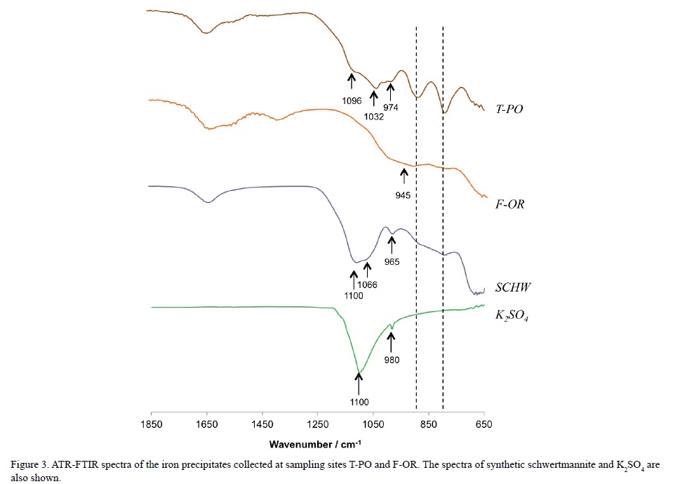 Figure 3 shows the ATR-FTIR spectra obtained for the iron precipitates and the synthetic analogues. Data analysis focuses on the 1200 900 cm-1 region, in which bands associated with sulphate vibrations (S-O stretching bands) are usually found. Bands at a lower wavenumber (represented by the dotted lines shown in Figure 3) can be assigned to Fe-O stretching. The number of peaks observed between 1200 and 900 cm-1, along with their relative intensity and position, are characteristic of the molecular symmetry and coordination of sulphate ions (Zhang and Peak, 2007). Clear differences between samples are observed. In the case of sample T-PO, three bands were detected in this region, which might be assigned to asymmetric stretching (ν3) bands (~ 1096 and ~ 1032 cm-1) and to a symmetric stretching (ν1) band (~974 cm-1). These bands, previously identified in different studies involving synthetic (Peak et al., 1999) and natural (Kumpulainen et al., 2007) iron oxides, are indicative of the presence of adsorbed or structural sulphate groups. Splitting into separate ν3 bands is common for iron oxides formed at low pH (Fukushi et al., 2013; Tresintsi et al., 2014) and was also observed in the synthetic schwertmannite analysed (~ 1110 and ~ 1066 cm-1). This suggests that sulphate groups are present as inner-sphere complexes on the mineral surface and on the crystalline structure. If outer-sphere complexes were dominant, a broader band (with no peak splitting) would be observed at 1100 cm1, resembling the FTIR spectra of free sulphate groups. In the case of the F-OR precipitate, these bands were not present, which suggests that sulphate groups were not adsorbed as inner- or outer-sphere complexes. Considering the results reported by Kumpulainen et al. (2007), iron oxides collected from mine soils of neutral pH (as in the present case) do not display S-O stretching bands. Therefore, the broad band at 945 cm1could be assigned to Fe-O-Si, indicating co-precipitation or adsorption of silicate groups. However, the nature of sulphate groups present in the F-OR precipitates and detected by analysis of the chemical composition remains unresolved. Further analysis using more advanced techniques, such as X-ray absorption spectroscopy or X-ray photoelectron spectroscopy, should be carried out to clarify the nature and the location of the sulphate groups present in the iron precipitates under study.