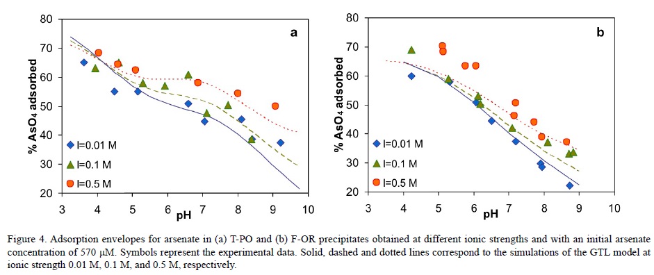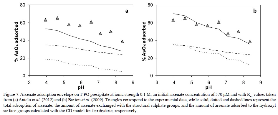 The adsorption of arsenate as a function of pH and ionic strength is shown in Figure 4, along with the GTL modelling predictions. Adsorption decreased gradually and continuously as pH increased in the range 3 10. This decrease can be explained by the fact that the surface of the iron oxide becomes negatively charged (or less positively charged) as the pH increases. Greater electrostatic repulsion will occur towards the less protonated arsenate species that predominate at the highest pH values, favouring the mobilization of arsenate. In addition to surface complexation with the iron hydroxyl groups present at the mineral surface, adsorption of arsenate on sample T-PO, which can be defined as a mixture of goethite and schwertmannite particles, involves anion exchange reactions with the sulphate ions present in the schwertmannite crystalline structure. Evidence for anion exchange reactions involving sulphate release from schwertmannite has been obtained in different studies (Burton et al., 2009; Antelo et al., 2012). The exchange coefficient (Rex) values obtained in those studies were pH dependent and always lower than 0.5 mol SO4/mol AsO4. An exchange coefficient below 1 can be interpreted as being due to partial substitution of the structural sulphate by the arsenate ions and the co-existence of both adsorption mechanisms. However, as the pH increases, structural sulphate may be substituted by OHions and surface complexation with the iron hydroxyl groups will become the main adsorption mechanism. Unfortunately, in the present study sulphate concentration was not measured after arsenate adsorption and therefore the exchange coefficients cannot be calculated.