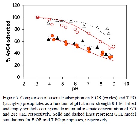 The adsorption of arsenate on T-PO and F-OR precipitates is compared in Figure 5 for two different arsenate loadings. At the lower pH, adsorption on both precipitates is similar, but at pH above 5 6, adsorption on T-PO is higher at both arsenate loadings. The specific surface area of sample F-OR (216 m2/g) is greater than that of sample T-PO (127 m2/g) and therefore the former is expected to be more reactive. Nevertheless, as stated above, the structure of sample T-PO partly resembles that of schwertmannite particles, while sample F-OR can be described as ferrihydrite-like. In addition to the surface complexation of arsenate on the surface hydroxyl groups, which is possibly the only adsorption mechanism in sample F-OR, anion exchange reactions may occur in sample T-PO. Another possible explanation for the observed differences in the reactivity of both samples is the presence of co-precipitated trace metals. The T-PO precipitate contains larger amounts of Cu, Zn and Ni. The presence of trace metals in the crystalline structure may increase the adsorption of arsenate by 20 30 %, as already observed for schwertmannite and goethite (Mohapatra et al., 2006; Antelo et al., 2013). The presence of co-precipitated ions and their incorporation in the crystalline structure may lead to changes in the surface properties of the oxides (specific surface area, surface charge and point of zero charge).