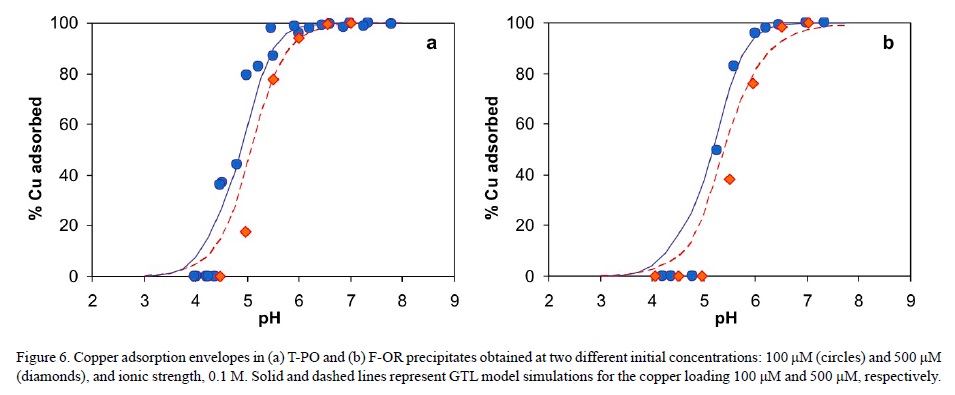Copper adsorption on the natural precipitates shows the typical trend observed for metal retention by iron oxides (Jönsson et al., 2006; Ponthieu et al., 2006; Moon and Peacock, 2013) (Figure 6). Thus, the level of adsorption varied from 0 to 100 % within approximately two pH units. Both iron precipitates exhibited very similar behaviour, with the curves for F-OR shifted slightly towards higher pH. A previous study by Swedlund and Webster (2001) showed that copper has a higher affinity for synthetic schwertmannite than for synthetic ferrihydrite. These authors reported that at pH 4, 10 % of the copper was adsorbed on ferrihydrite and 30 % on schwertmannite, and at pH 5 the levels of adsorption were 80 % and 90 %, respectively. In the present study, more copper was adsorbed onto the T-PO precipitate (schwertmannite-like) than onto the F-OR precipitate (ferrihydrite-like) at the same pH. This result is consistent with the previous finding for arsenate, which displays a higher affinity for the surface of the T-PO sample. The difference observed in the case of arsenate was explained by the anion exchange reactions between structural sulphate groups and arsenate ions; however, this adsorption mechanism should not contribute to cation binding. Nevertheless, the presence of sulphate in the crystalline structure, along with other co-precipitated ions (Table 2), may alter the surface properties of these iron oxides. Assuming the same site density for iron hydroxyl groups in both precipitates, the observed differences in copper adsorption may be attributed to differences in the protonation constants or the metal affinity constants.