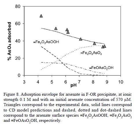 Arsenate adsorption onto the F-OR precipitate was reasonably well simulated using the CD model (Figure 8), indicating that surface complexation to the iron hydroxyl groups is the main adsorption mechanism and no additional reactions needed to be considered. Modelling simulations were conducted using the SSA obtained by the BET method, the surface site densities proposed for ferrihydrite particles and with the modelling parameters shown in Table 4. Optimization of the affinity constants may yield better prediction of the arsenate adsorption at the lower pH values, although for reasons of simplicity no extra fitting was conducted. Figure 8 also shows the abundance of arsenate surface species as a function of pH according to the CD model predictions. Under these conditions, the dominant surface species are the bidentate complexes, which are protonated at low pH and non-protonated at high pH. These calculations showed that the non-protonated bidentate complex is the major surface species at intermediate to high pH. The protonated monodentate complex, at the lower pH values, contributes to the arsenate adsorption to a lower extent than the protonated bidentate complex, although it makes a higher contribution at relatively high pH.
