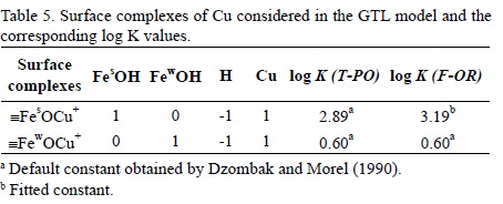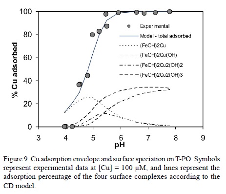 In the next step, the surface complexes postulated by Weng et al.(2008) for describing Cu adsorption on goethite were used (Figure 9). Four bidentate inner-sphere complexes were considered between copper and the singly coordinated surface sites of the goethite, allowing for hydrolysis and dimer formation in copper surface species. The stoichiometry of the surface species and the charge distribution between the planes that comprise the solid/solution interface are shown in Table 4 and the corresponding surface reactions are: