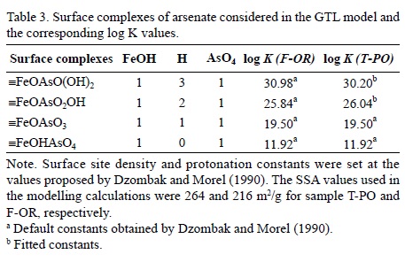 To describe the experimental results using the GTL model, we assumed that only ligand exchange reactions occurred between the arsenate and the hydroxyl surface groups. In order to minimize the fitting parameters, i.e. parameters that need to be adjusted, anion precipitation and anion exchange reactions were not considered in the modelling calculations. The default values proposed by Dzombak and Morel (1990) for the surface parameters (specific surface area, site density) of hydrous iron oxides were initially considered in the calculations, along with the protonation constants, log KH1 and log KH2. Finally, the values for the arsenate surface complexation constants were initially taken from the database available in Visual MINTEQ, and extra fitting, or adjustment, was conducted when necessary. The arsenate surface complexation constants are shown in Table 3, and the corresponding model predictions for adsorption on both iron precipitates are shown in Figures 4 and 5. Use of the default SSA value for hydrous iron oxide (600 m2/g) in the calculations led to overestimation of the adsorption of arsenate on the precipitates. Although the BET method may underestimate the real surface area of amorphous iron oxides due to the aggregation of particles, the experimental values obtained were considered in the modelling calculations.