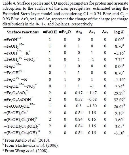 In a more realistic approach, CD model calculations were also conducted by initially assuming that the iron precipitates behave like ferrihydrite particles. Hiemstra and Van Riemsdijk (2009) proposed a ferrihydrite surface model based on goethite, with equal proportions of the crystal faces (110), (001), and (021). Surface site densities of 6 nm-2 and 1.2 nm-2 were considered for the singly and triply coordinated groups respectively, while the SSA determined by BET were used in the calculations. The affinity constants for protons and electrolyte ions were taken from Antelo et al. (2010) and are shown in Table 4. Arsenate adsorption was modelled by assuming the presence of protonated and non-protonated bidentate complexes, because the available data on iron oxides indicates both complexes as predominant (Waychunas et al., 1993; Stachowicz et al., 2006); formation of a protonated monodentate complex was also considered. The surface reactions for the three surface complexes can be formulated as follows: