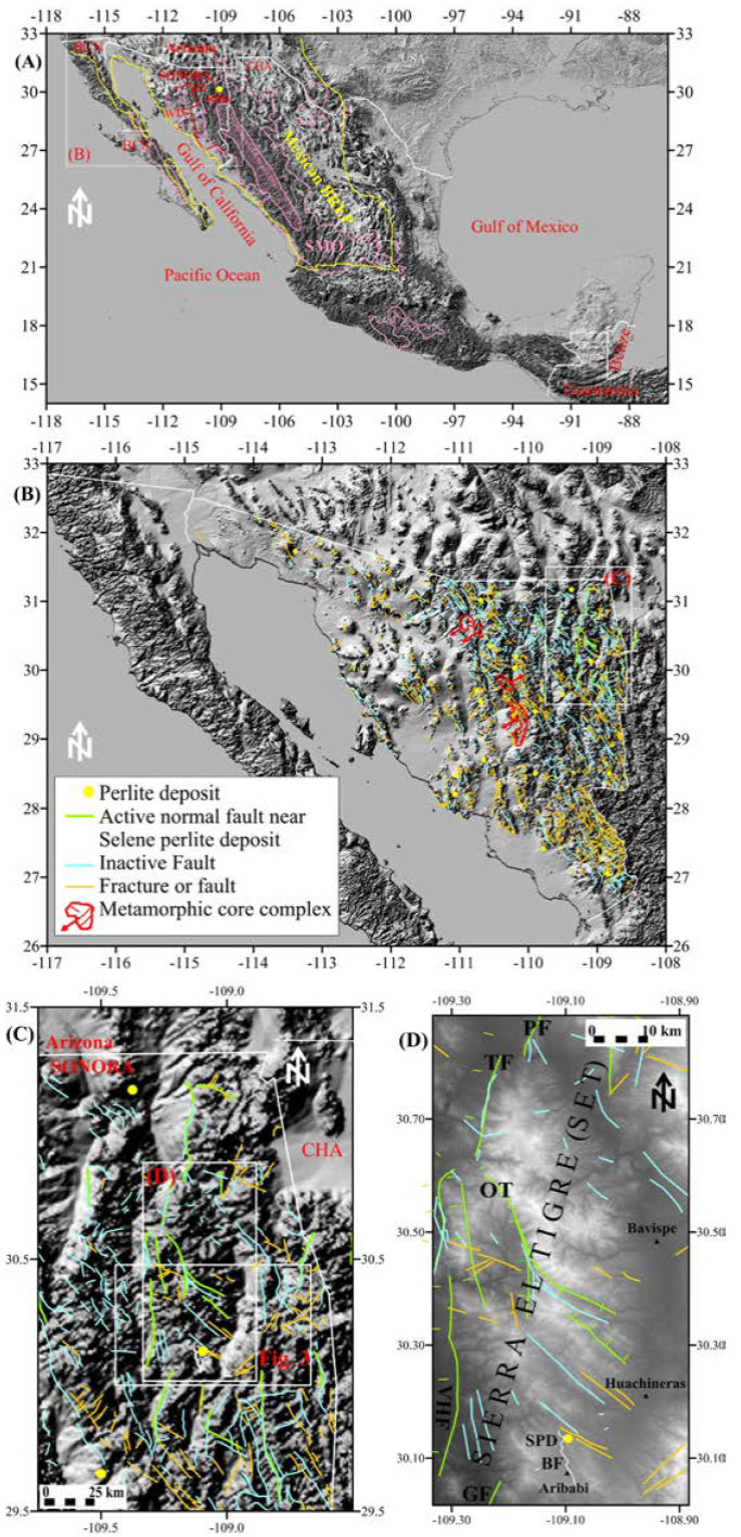 Figure 1 Terrain Map of Mexico showing the distribution of the Sierra Madre Occidental (SMO) silicic large igneous province (pink), the Mexican Basing and Range Extensional Province (BREP) (yellow), and the west-tilted (wt) and east-tilted (et) domains in Sonora divided by the red line (after Gans, 1997) (A). Shaded area inside the SMO corresponds to the unextended core of the SMO. SPD-Selene perlite deposit (in A and D); BCN-Baja California Norte; BCS-Baja California Sur; CHA-Chihuahua. Map in (A) compiled after Henry and Aranda-Gomez (1992); Gans (1997); Staude and Barton (2001); Ferrari et al. (2007); and Bryan et al. (2008). Distribution of Sonoran perlite ore deposits and main structures (B). Note close proximity between normal faults and fractures relative to perlite localities. Metamorphic core complex (MCC) with slip-vector (black arrow) after Nourse et al. (1994); Vega-Granillo and Calmus (2003); Hines and van der Pluijm (2008, 2012); and Wong et al. (2010). Close-up of northeastern Sonora showing active (Suter, 2008a, 200b, 2015; Castro et al., 2010; Villalobos-Escobar and Castro, 2015) and inactive (Arriaga-Meléndez et al. , 2008) normal faults and related fractures around the Sierra El Tigre (SET) (C). Close-up of the SET showing the location of the Selene perlite prospect relative to the Babidanchic normal fault, population centers, and NS-trending active and NW-SE-trending inactive normal faults and related fractures (D). PF-Pitáycachi fault; TF-Teras fault; OF-Otates fault; VHF-Villa Hidalgo fault; GF-Granados fault; BF-Babidanchic fault.