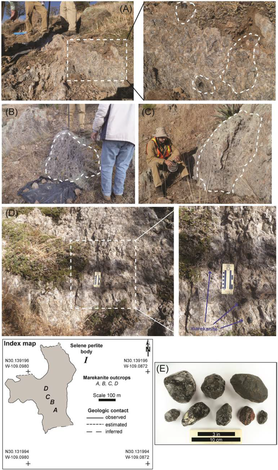 Figure 10 Representative field photographs of marekanite outcrops (A-D) within perlite ore body I and extracted marekanite samples (E) to highlight color, size, and shape. Outcrop A is characterized by marekanites floating in a mildly perlitic texture (A) dominated by contorted bands of fine-grained rhyolitic composition that indicates less hydration compared to adjacent outcrops B, C, and D which show marekanites embedded in a well-defined perlitic texture in turn suggesting more hydration.