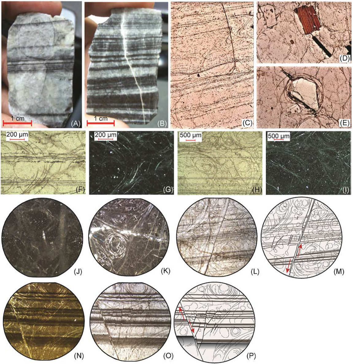 Figure 11 Thin sliver cut from a hand sample of the Selene perlite showing two types of obsidian banding flow (A and B). Poorly developed perlitic fracture in a contorted flow texture marked by fluid inclusions (C); plane polarized light and a 5× objective. Photomicrograph showing a mineralogical association of alkaline feldspar, biotite and quartz in a glassy matrix of incipient perlitic texture (D); plane polarized light and a 5× objective. Fractured quartz phenocryst as a core of the perlitic fracture development, 5× objective, natural light (E). Thin-sections show that the perlitic glass contains abundant microphenocrysts and bands that are defined by varying concentrations of aligned microlites; polarized light (F, H) and crossed nicols (G, I). Perlitic fractures filled by secondary minerals (J, K and N and a 10×, 2.5× and 2.5× objective, respectively); crossed nicols. Normal micro-faults in Selene perlite (L); plane polarized light, 2.5× objective. Structural interpretation of L (M). Same view as N in natural light (O) and a 2.5× objective. Structural interpretation of O (P).