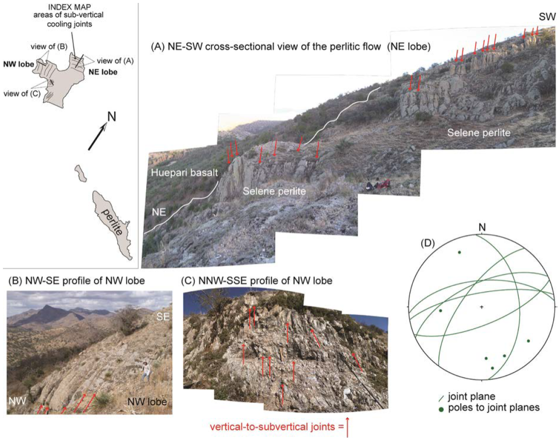 Cooling joints are abundant in the Selene perlite flow (Figure 12 A-D), and occasionally present in the flow-banded rhyolites and rhyolitic ignimbrites, but are not observed in the Huepari basalt. We focus on jointing in the Selene perlite flow where the spacing of the joints varies greatly. They are very closely spaced (30 to 50 mm) in the central part of the perlite body I (Figures 12 A-C), but at another outcrop in the NW lobe, numerous widely spaced (~ 800 mm) parallel joints trend NE-SW and dip SE at moderate angles. Very widely spaced (> 2 m) joints also occur at the edges of the NW and NE lobes (Figures 12 A-B). These joints trend east-west, are vertical to subvertical (Figure 12D), and have an orthogonal relationship with respect to layering. The cooling surface(s) controlled the orientation of the cooling joints. The middle and southernmost parts of the Selene perlite flow (i.e. , bodies I , V and IV in Figures 4 and 5A) overlie the Babidanchic rhyolitic ignimbrite sheet, while its northern, western, and eastern margins underlie the Huepari basalt (Figures 4 and 5 B-C). Perlitic ore bodies I and VI grade laterally in to the flow-banded rhyolitic lava flow (Figure 5). This gradation is relatively flat lying, follows a roughly constant elevation line (~ 1500 masl), and is seen in the west-central zone of the Selene perlite prospect (Figures 4 and 5A). This is the only area where we observe the Selene perlite flow grading into the flow-banded rhyolite lava flow (see Almazán-Holguín and Trelles-Monge, 1986).