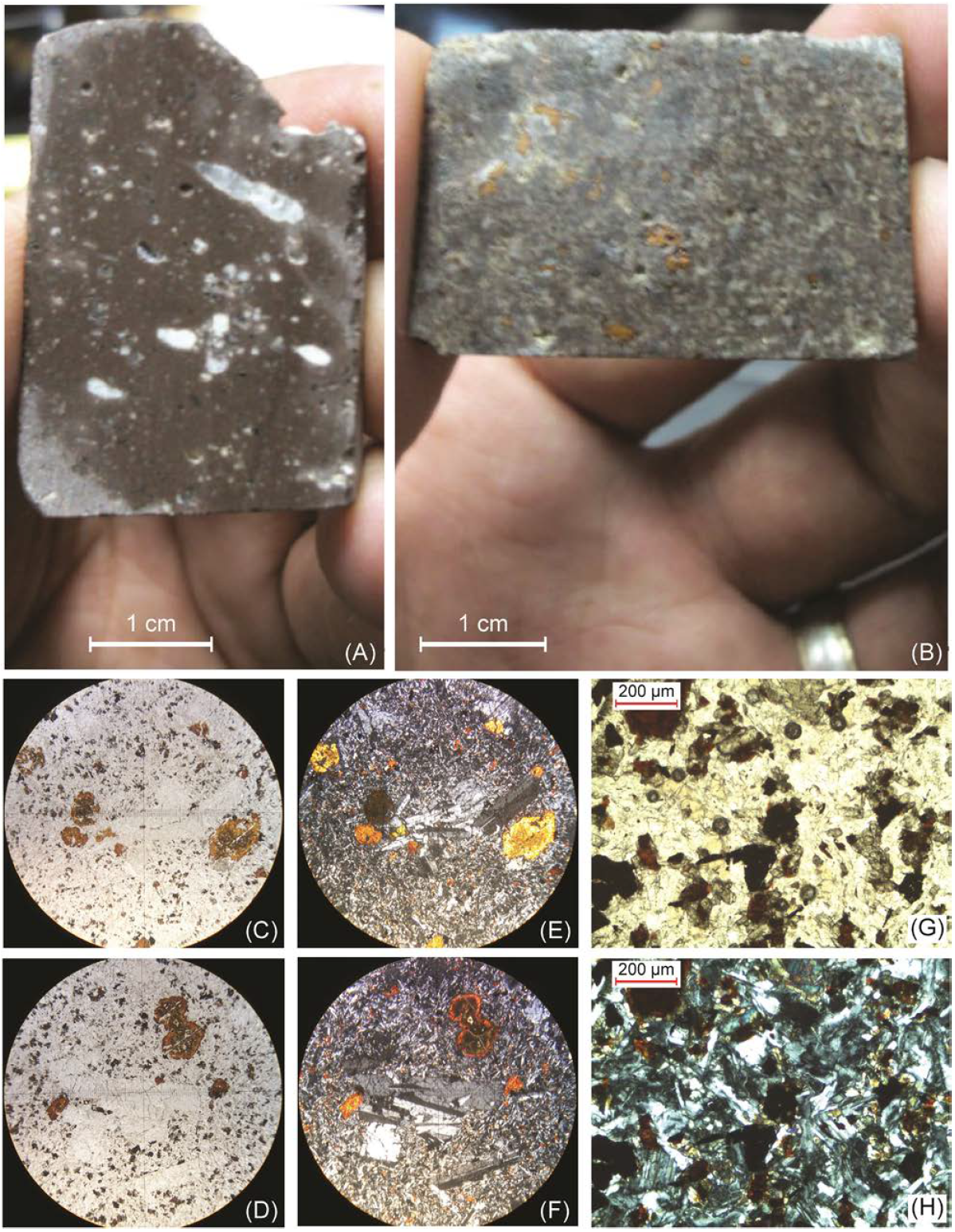 Figure 13 Thin slivers cut from a hand sample of the Huepari basalt and petrographic photographs. Slices show lenticular calcite-filled amygdules (A) and a porphyritic texture comprising plagioclase and oxidized olivine phenocrysts (B). Glomeroporphyritic texture with iddingsite olivine and plagioclase phenocrysts (C-F); 2.5× objective, plane polarized light and crossed nicols. Intergranular micro-crystalline matrix composed of plagioclase, olivine, clinopyroxene and Fe-Ti oxides; plane polarized light (G) and crossed nicols (H).