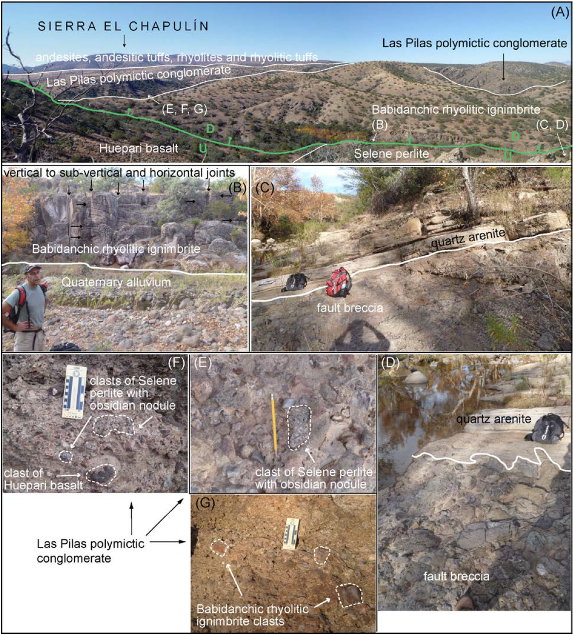 Figure 14 Representative panoramic photograph of the rocks west of the Selene perlite prospect viewing toward the west from the Selene perlite ore body I (A). The trace of the ~ NS-trending, W-dipping Babidanchic normal fault is drawn in (A). Fractured Babidanchic rhyolitic ignimbrite and Quaternary alluvium (B). Volcaniclastic Aribabi unit: basal fault breccia overlain by middle thin quartz-arenite (C-D), and upper Las Pilas polymictic conglomerate containing fragments of perlite, rhyolitic ignimbrites, and basaltic lavas (E-G). U-Upthrow block; D-Downthrow block.