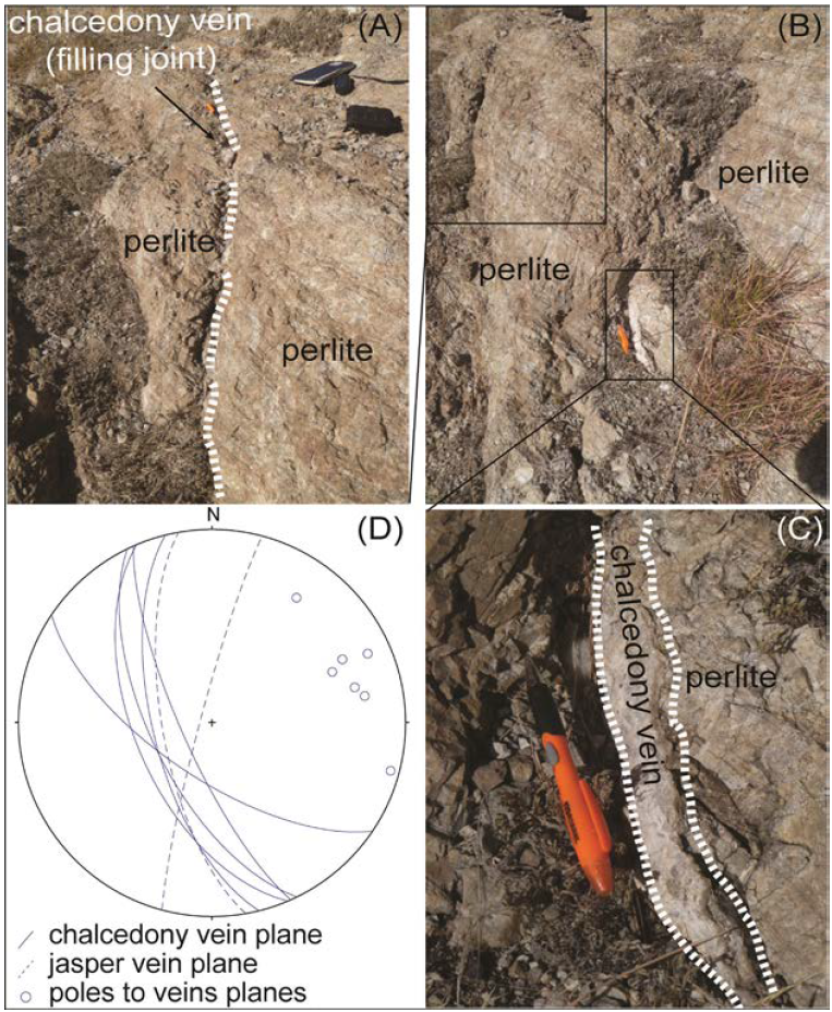 Figure 16 Representative field photographs of botryoidal chalcedony veins cutting the perlitic rocks of perlite ore body I (A-C); and structural data of chalcedony veins plotted in stereonet plot of equal-area lower-hemisphere projection (D). Chalcedony veins strike NNW and dip steeply towards the SW. Some chalcedony veins fill in joints oblique to the Selene normal fault plane and others are coplanar to the fault plane suggesting syn- or postkinematic nature.